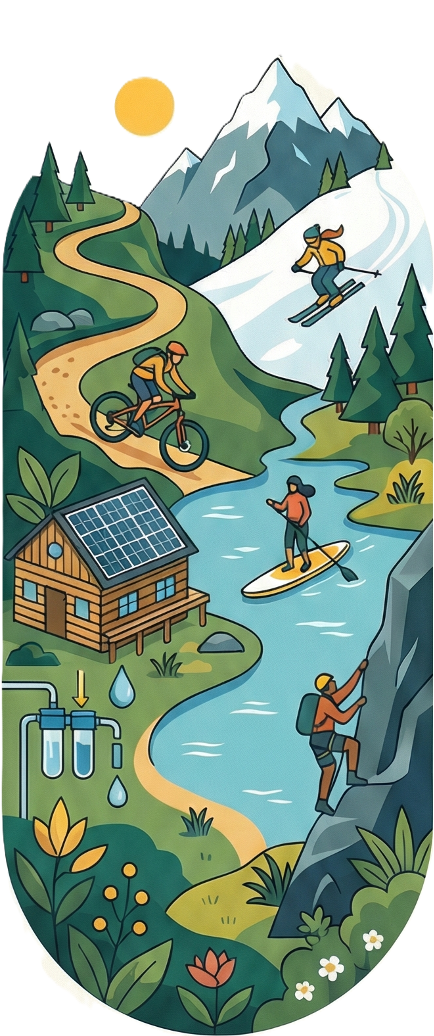 - Ökologie: Klimaschutz und CO₂-Bilanz, Energieeffizienz, nachhaltige Mobilität der Gäste, ressourcenschonender Materialeinsatz, Reparatur und Kreislaufwirtschaft